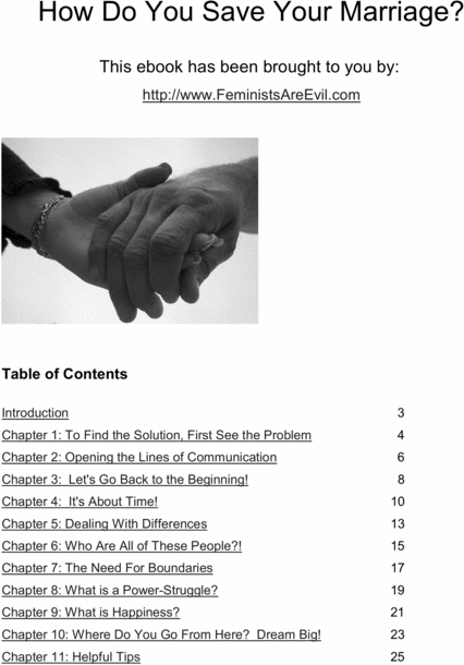 It's a common sense approach to saving your marriage, that will guide you step by step. This 18 page e-book starts you off by identifying the problems in your marriage. Then, explains how to open the lines of communication.