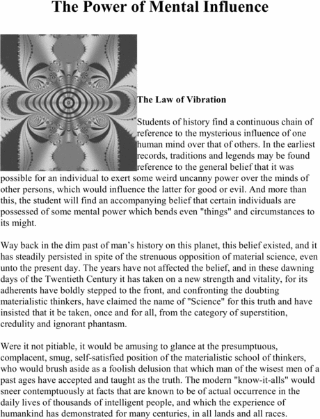 The Power of Mental Influence is course of lessons on mental vibrations, psychic influence, personal magnetism, fascination, psychic self protection.