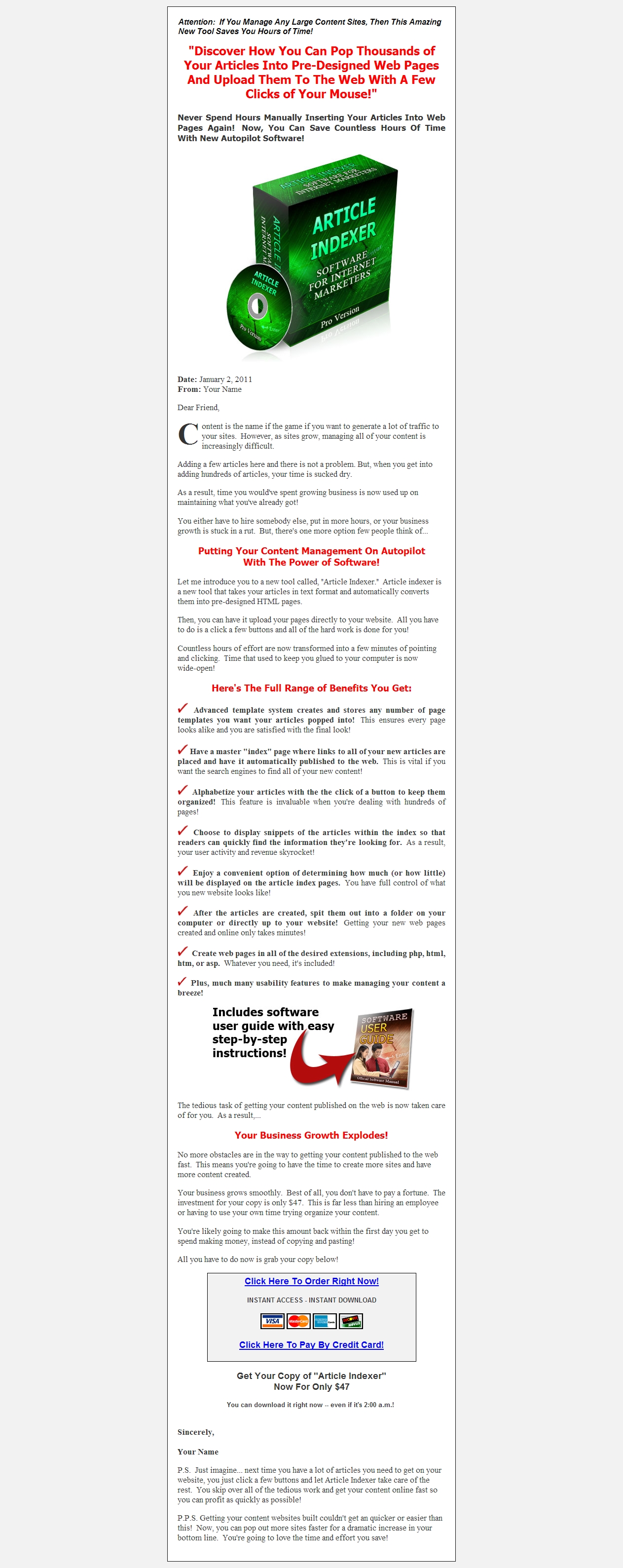 Let me introduce you to a new tool called, Article Indexer. Article indexer is a new tool that takes your articles in text format and automatically converts them into pre-designed HTML pages.