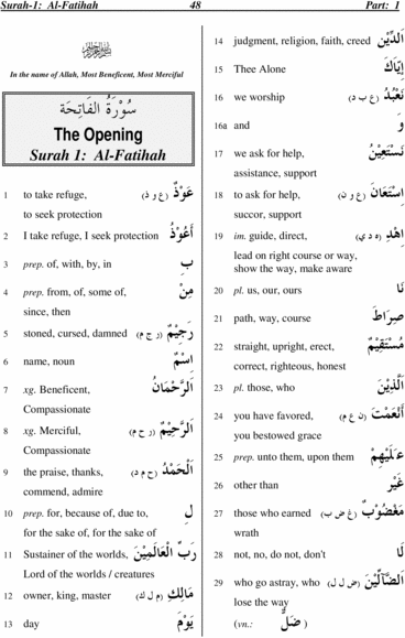 · It presents the meanings of the Arabic words of the Qur’aan in the order of their occurrence. It avoids repetition of words to a great extent. However, the words are repeated quite a few times for the facility of the reader.
