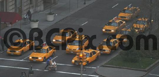 A royalty-free stock photo of a group of taxi cabs waiting at a Park Avenue traffic light in New York City, NY. (©Brian Cleary/https://www.tradebit.com)