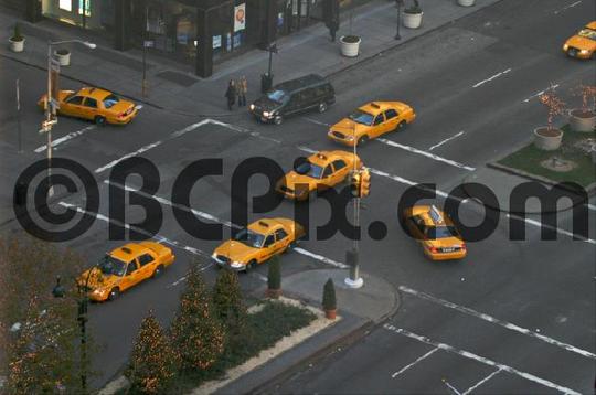 A royalty-free stock photo of a group of 7 taxi cabs driving through an intersection in New York City, NY. (©Brian Cleary/https://www.tradebit.com)