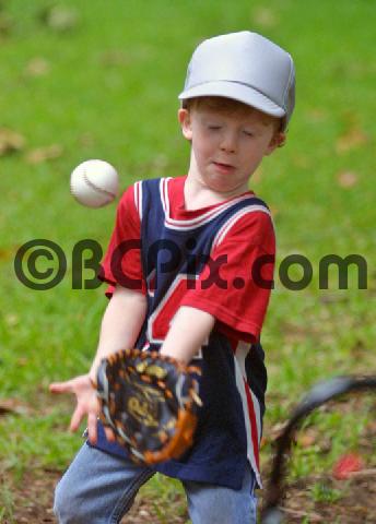 A royalty-free stock photo of a little boy in a baseball cap and glove closes his eyes as he catches a baseball while he practices. (©Brian Cleary/https://www.tradebit.com)