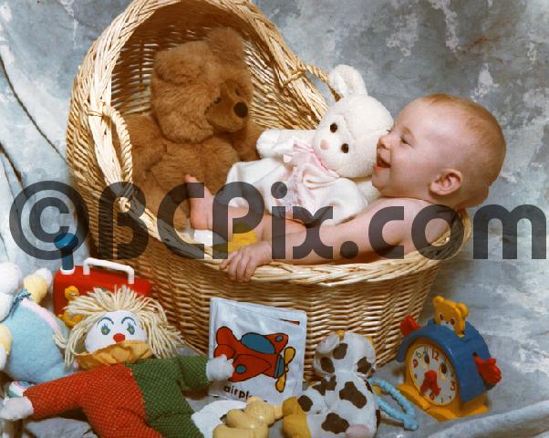 A royalty-free stock photo of a laughing baby in a basket surrounded by stuffed animals and toys. (©Brian Cleary/https://www.tradebit.com)