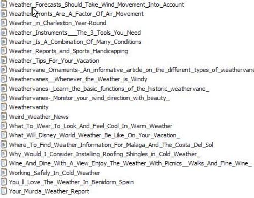 This PLR package includes articles on weather forecast, weather fronts, instruments, sports handicapping, vacation, weathervane, wierd weather, news, cold weather, plus much, much more.