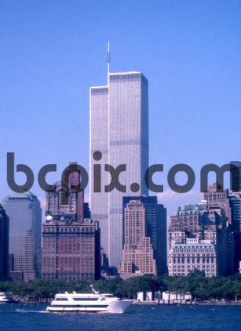 The Twin Towers of the World Trade Center dominate the New York City skyline in the pre-9-11 summer of 1999. (Photo by Brian Cleary/https://www.tradebit.com)