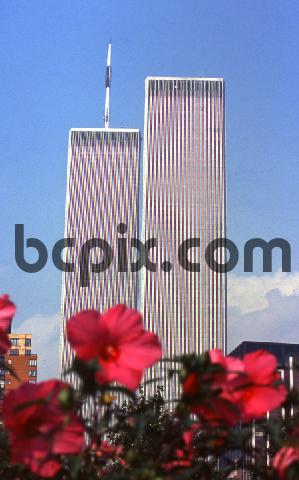 The Twin Towers of the World Trade Center rise above a flowerbed as they dominate the New York City skyline in the pre-9-11 summer of 1999. (Photo by Brian Cleary/https://www.tradebit.com)