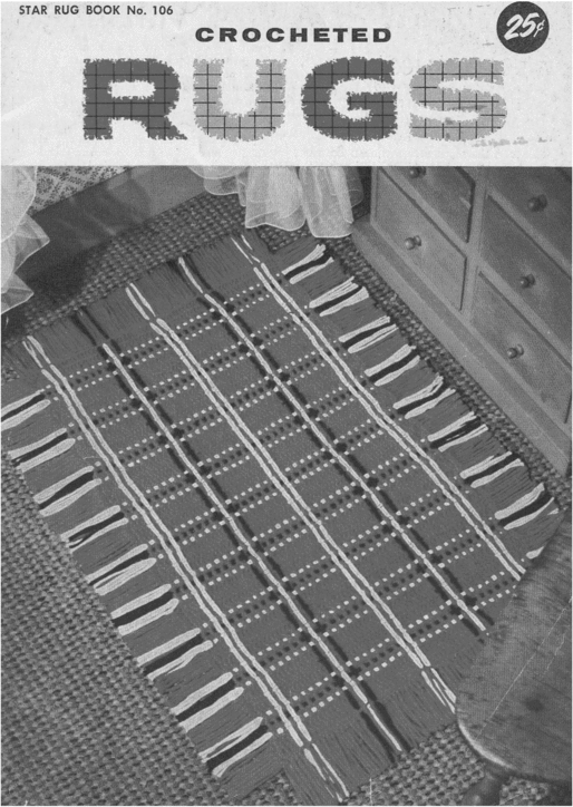 Crocheted Rugs - Star Rug Book No. 106. A collection of patterns for your Mid-Century Modern home! Includes Home Sweet Home Plaid, Dot Dot Dash, Young Modern Waffle Stitch, Biarritz Embroidered Blocks, The New Granny, Provincial 'woven' crochet, Happy the Clown Embroidered, Country Home, Cliff Dweller, Regimental Stripes, Round and Round Loop Stitch Oval, Day and Night, Pinwheel, Contemporary Loop Stitch Squares, Santa Fe Modern. All use rug yarn.