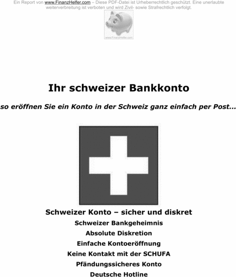 In diesem Report erfahren Sie, wie Sie ein Schweizer Bankkonto eröffnen können. Sie brauchen dazu nicht mal in die Schweiz zu reisen. Mit ein paar Tricks eröffnen Sie Ihr Pfändungssicheres Konto ganz bequem online.