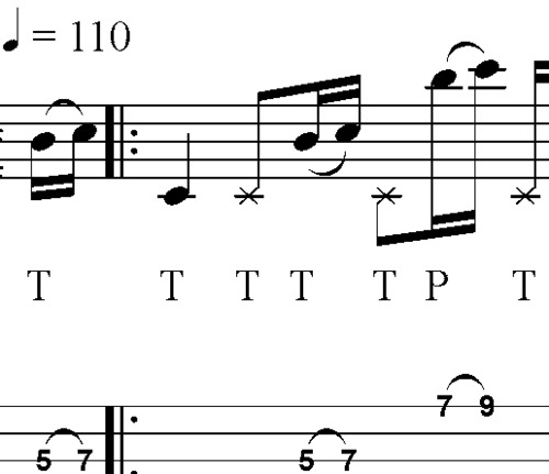 A basic slap & pop line in Em or E7 (no third so it can be Major or minor both). Typical b7 and 6 to octave.