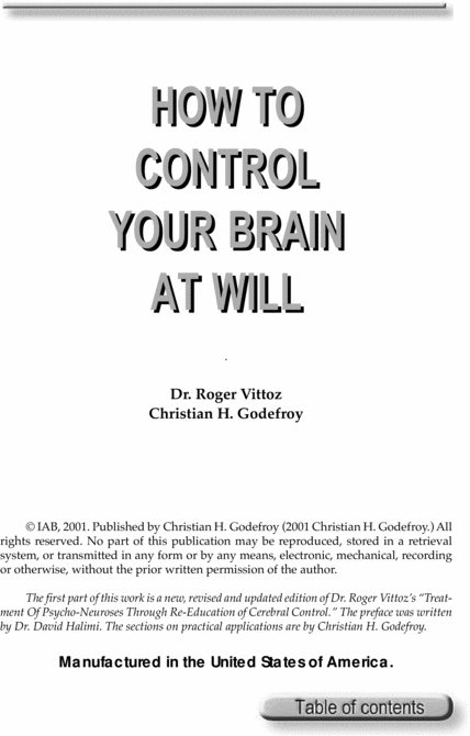 We are convinced that anyone who puts these theories into prac- tice, and who perseveres, will be able to overcome any of the psycho- behavioral or organic disorders they are suffering from. And curing physical and mental suffering without having to rely on medication is the challenge which the author of this method has taken on... for the health and happiness of his fellow beings.