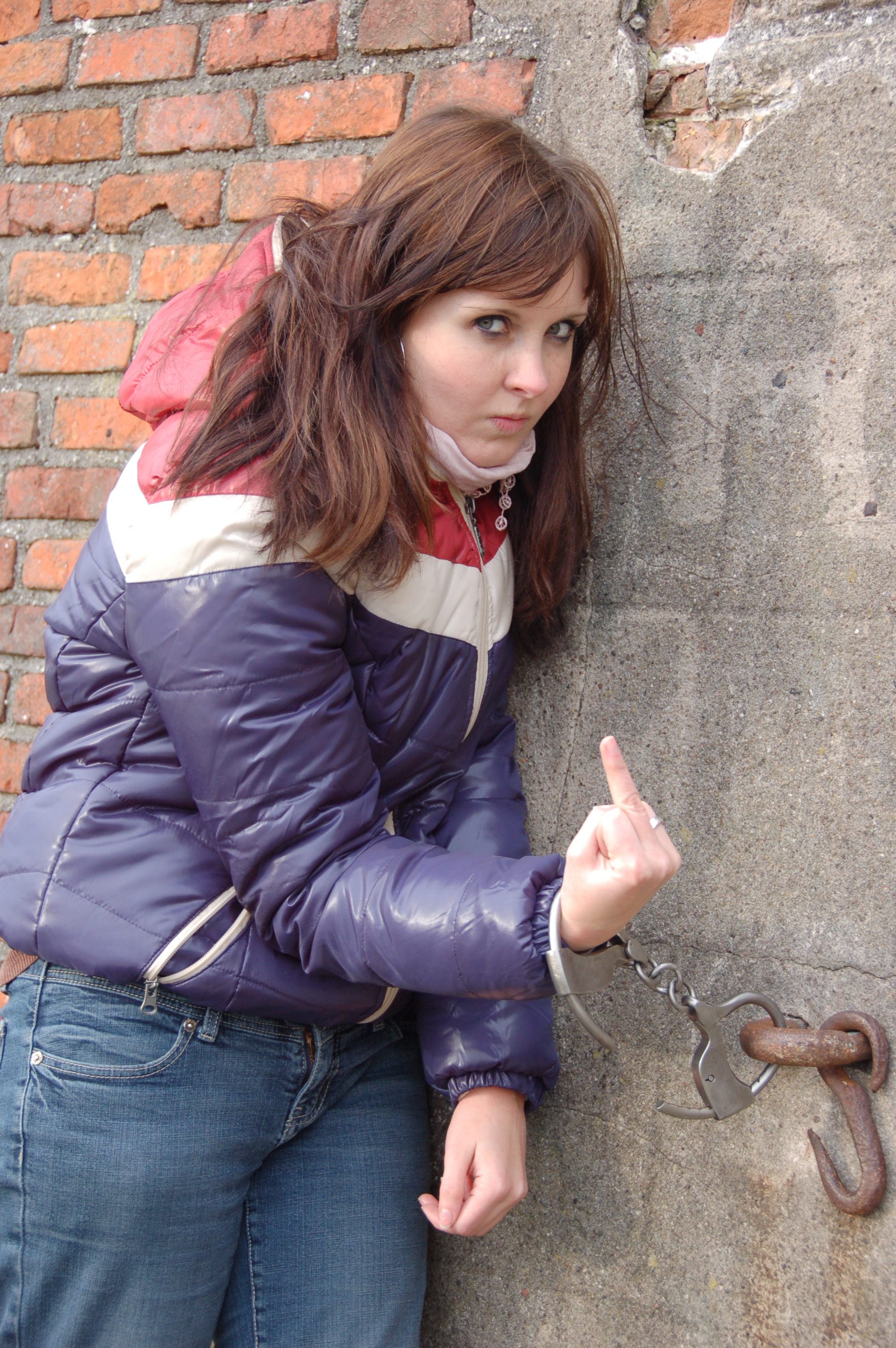 102 Pictures of our lovely model Tanya, showing a nice pair of TOWERS handcuffs