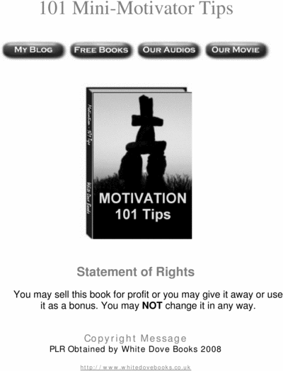 The e-book you are about to read is packed full of helpful tips and techniques that are designed to give you the boost you need! There are 101 tips listed in the following pages, but don’t be surprised if you find yourself coming up with other creative ideas just by skimming through them. There are many more ways to motivate yourself than I could possibly list in a book, but those listed should be enough to get your creative juices flowing and get some great motivation building.