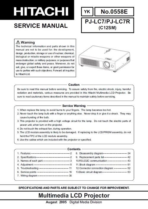 Hitachi PJ-LC-7 & LC-7R Projector Original Service Manual in PDF