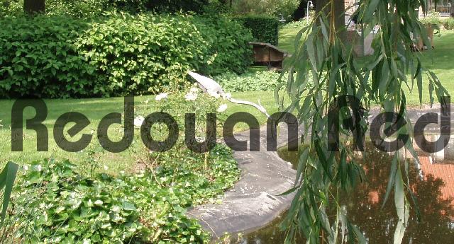 Photograph for $ 9.99: Blue heron statue standing at a pond in a drinking pose in a beautiful green surrounding. Very clear reflecting water and sunshine on the green tree leafs and bushes.