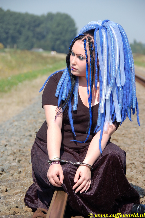 Here's the first set of 3. We cuffed her with a pair of the Dutch Hinged LIPS handcuffs at the railtrack