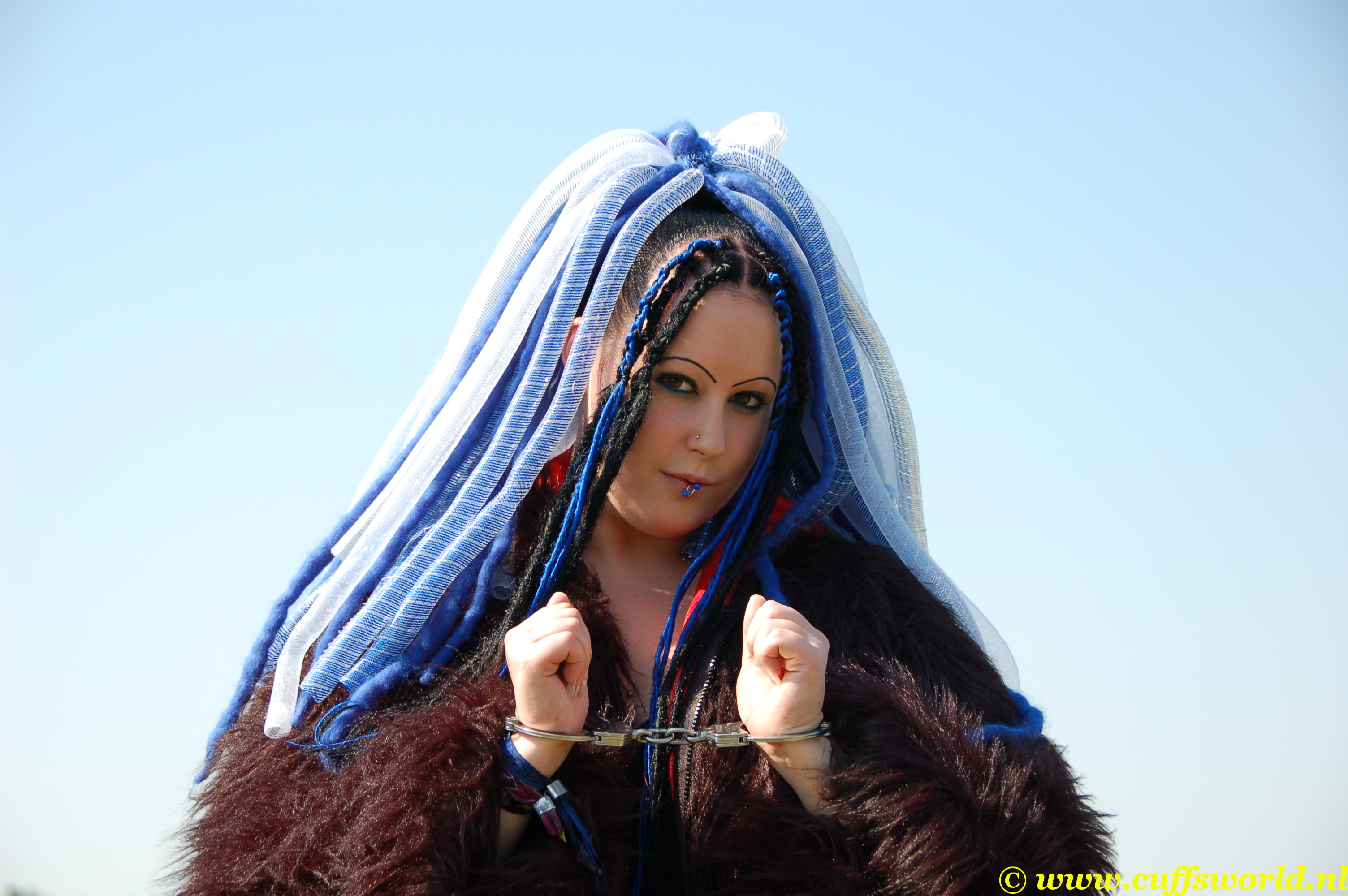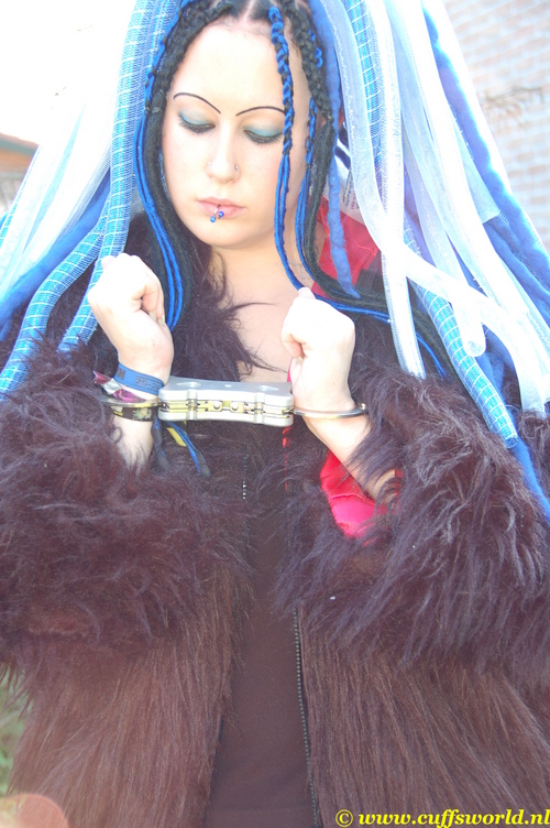 Heres the third set of 3. This time she put black yeti jacket on and we cuffed her up with The Tsjechian Riged ralkem handcuffs, Hiatts Speedcuff and a set Korean chainlink cuffs from Kyoung Chang