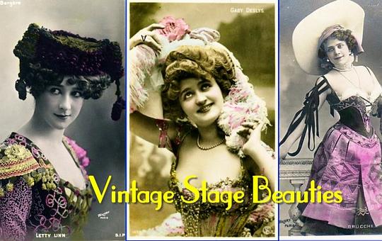 A digital scrapbook of early photo portraits featuring some of the prettiest lady actresses, and dancers from the early 20th century stage. Many of these images are taken from early picture postcards, which acted as souvenirs and promotional publicity materials. Glamorous girls, glitzy fashion costumes... many in hand-tinted color.