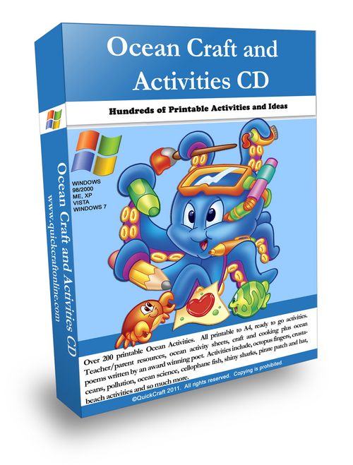 Over 200 printable Ocean Activities. All printable to A4, ready to go activities. Click on the product image to read more. Teacher/parent resources, ocean activity sheets, craft and cooking plus ocean poems written by an award winning poet. Activities include, octopus fingers, crustaceans, pollution, ocean science, cellophane fish, shiny sharks, pirate patch and hat, beach activities and so much more. For use year after year, quick and easy to use. A fantastic addition to your ocean theme unit or at home for children with an interest in the ocean.