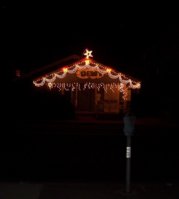 An original mystrical, magical Christmas Holiday photo of a building strewn with some Christmas lights, from across the street. The shot is quaint and has character. It brings to mind nostalgia.