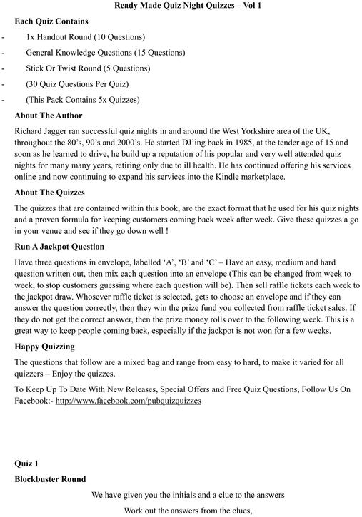 The quizzes that are contained within this book, are the exact format that he used for his quiz nights and a proven formula for keeping customers coming back week after week. Give these quizzes a go in your venue and see if they go down well !