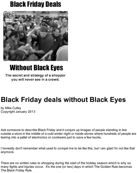 The only secret and strategy youll ever need to know is right here. You wont find this secret and strategy anywhere on the internet unless its me telling it to you! Instead of spending hours at a store, with this strategy you will be in and out in less than an hour without ever being part of the chaos. Imagine no more crowding outside a store with hundreds of people for hours or being part of a chaotic crowd ripping into plastic pallets. Ive been applying this strategy to the best kept secret about holiday shopping for years and after three successful years doing it I am ready to tell a select number of people. Do you want to know a secret you dont want to share? If your time is valuable, and you want to save money, and not get hurt at sales during the holiday season this is all you need to know.