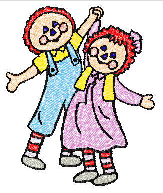 Rag dolls toy dancing doll pair embroidery design. Raggedy ann and andy look alike dolls. Available for Melco, Tajima, Brother Industrial, Disney 2002/2003, Innovis, 1500/2500/4000/500/1000, PC 7500/8500/8200, PE 100/200/300S/400B/150/180D/170D PR 600C, SE 270D, ULT 2001/2003/200X, Babylock, Accent, BL60E, Ellageo, Ellegante, EMP6, Esante, Ellure, Barudan, Bernina, Artista, 630E/640E, Deco 330/500/600/650, Pfaff, Creative, 2124/2134/2140/2144, PC 2140/7560/7570, Macintosh, Viking, Huskygram, Designer, SE, Iris, Rose I/II, Scandinavia, 300/400, Husqvarna, Kenmore, 19000/19001, Elite, 19005, Ergo 19010, Janome, 10001, MC 11000/10000/300E/5000/5700/8000/9000/9500/9700, Great Notions, Renaissance, Swf, Simplicity, Elna, 8006/8007/9006, Envision CE20, Happy, Toyota, Industrial, Poem, White, 3300/4400, Zsk and Singer embroidery machines and any other embroidery machine that uses the following formats exp, dst, pes, pcs, pcm, hus, sew, jef, csd and xxx formats. Embroidery design patterns can be used for commercial industrial and personal home sewing embroidery machines. Download and embroider today!