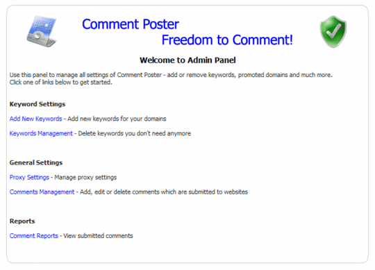 Comment Poster is powerful and very easy to use next generation SEO tool to automate links building campaigns. Comment Poster will submit your comments with backlinks to your website on thousands of your niche related websites on the Internet automatically. Comment Poster is an ideal solution for webmasters who want to get thousands of highly targeted backlinks and increase their AdSense or affiliate earnings dramatically. Comment Poster not only will help you to get better rankings on search engines, but also will help you to build massive traffic to your pages, what is the most important part of monetizing websites. This new generation software is the only tool designed to start massive links building campaigns, has many options you can customize and is 100% automated. Comment Poster supports standard and SOCK proxy servers, requires no programming skills and takes only 2 minutes to install and start new SEO campaign.