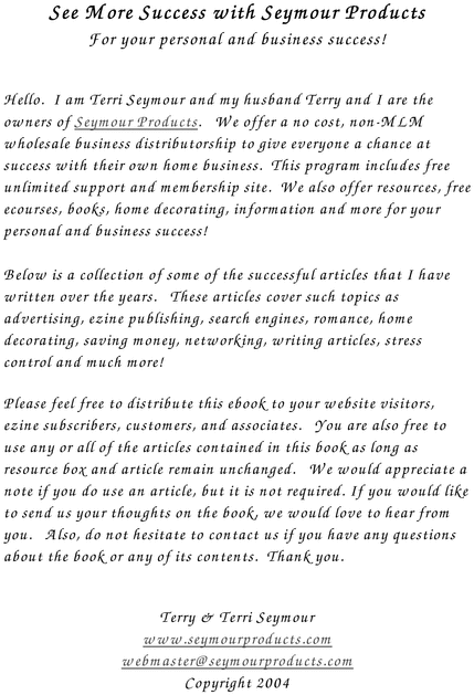 Husband and wife Internet marketers Terry and Terri Seymour, offer useful advice to those with a desire to start an online business. Noting that starting a business online is not an easy task, the Seymours offer insight into three essential online marketing elements, to help guide beginners toward achieving online marketing success. Download your e-Book today!