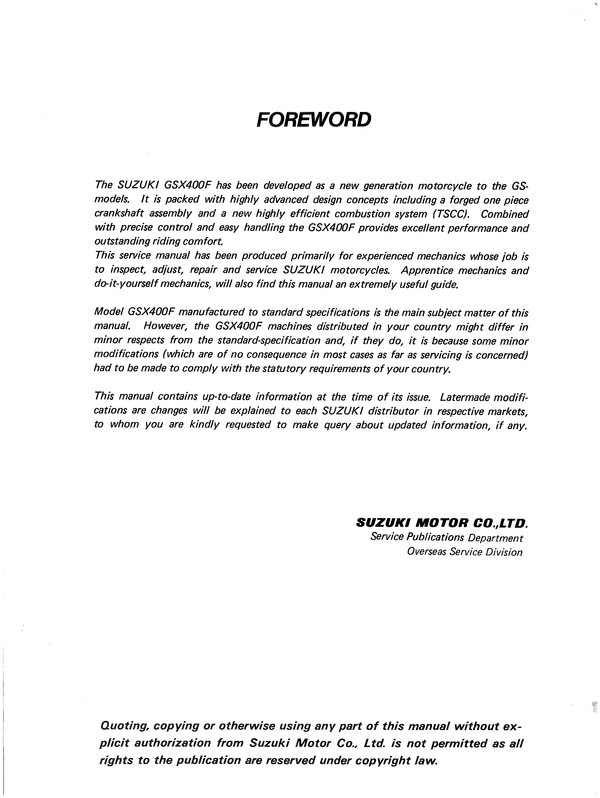 This 1981 1982 1983 Suzuki GSX400F Service Repair Manual Download topics are covered complete Step-by-step instruction, diagrams, illustration, wiring schematic, and specifications to repair and troubleshoot.