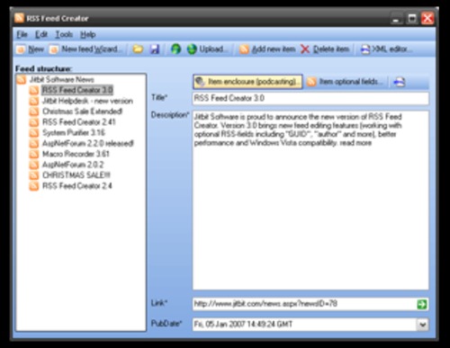 "RSS Feed Creator" is an RSS feed maker software application, which allows creating, modifying, viewing and publishing RSS feeds and podcasts. The program is extremely easy to use and allows professional RSS feed creation with minimal effort.