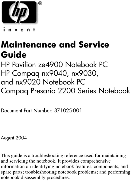 An official HP Pavilion ZE4900 Maintenance and Service Guide as used by professional technician to maintain and repair the HP Pavilion ZE4900 notebook PC.