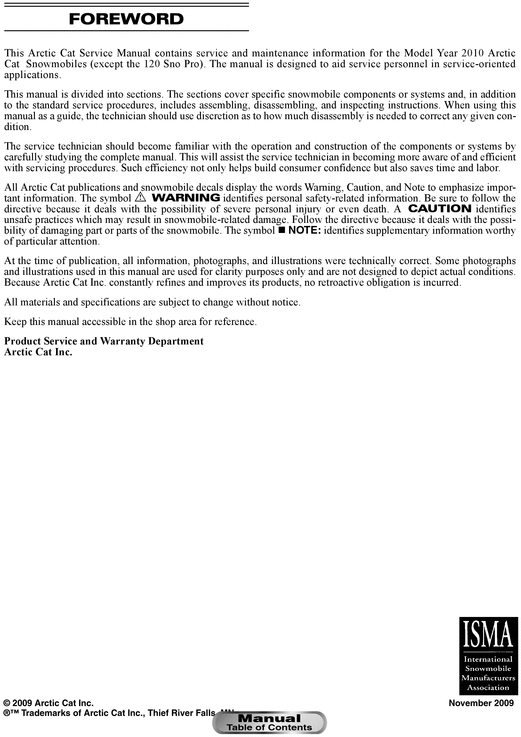 Arctic Cat Snowmobile 2010 Service Repair Manual