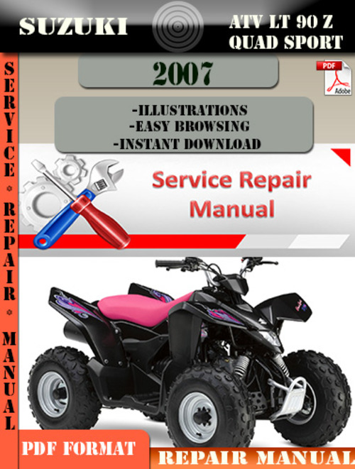 This is a complete Suzuki ATV LT 90 Z Quad Sport 2007 Service and Repair Manual ! It contains evrey information and detalis you need to help you not only fix your vehicle problems, but also maintain your vehicle good functioning for future use ! This manual is also a very reliable source of information that will make you, in time know more and more about your vehicle and how to prevent future problems from happening !!