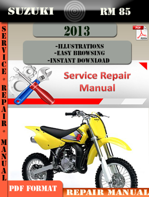 This is a complete Suzuki RM 85 2013 Service and Repair Manual ! It contains evrey information and detalis you need to help you not only fix your vehicle problems, but also maintain your vehicle good functioning for future use ! This manual is also a very reliable source of information that will make you, in time know more and more about your vehicle and how to prevent future problems from happening !!