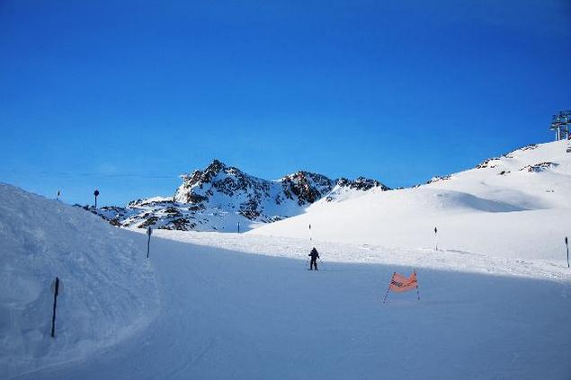 A man skis in Pitztal (Austria) with a mount in background. 10 Mpix.