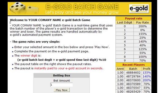 A simple yet highly addictive E-Gold game, which is fully automated allowing the user to gamble their money and depending on the batch id generated by E-Gold you can give payout rates to your users. The whole proccess is automated with no chance of cheating as the outcome is generated by E-Gold and not by this script. The user can check the outcome themselves. All payments are instantly made to the user, and requires absolutely no administration. The affiliate system writtern into the script allows you to pay your affiliates a small proportion of the amount gambled. This is done by not user sign ups but by direct linking to E-Gold numbers meaning affiliates and users never need to register. The game can be up and running in seconds and earn almost imediately.
