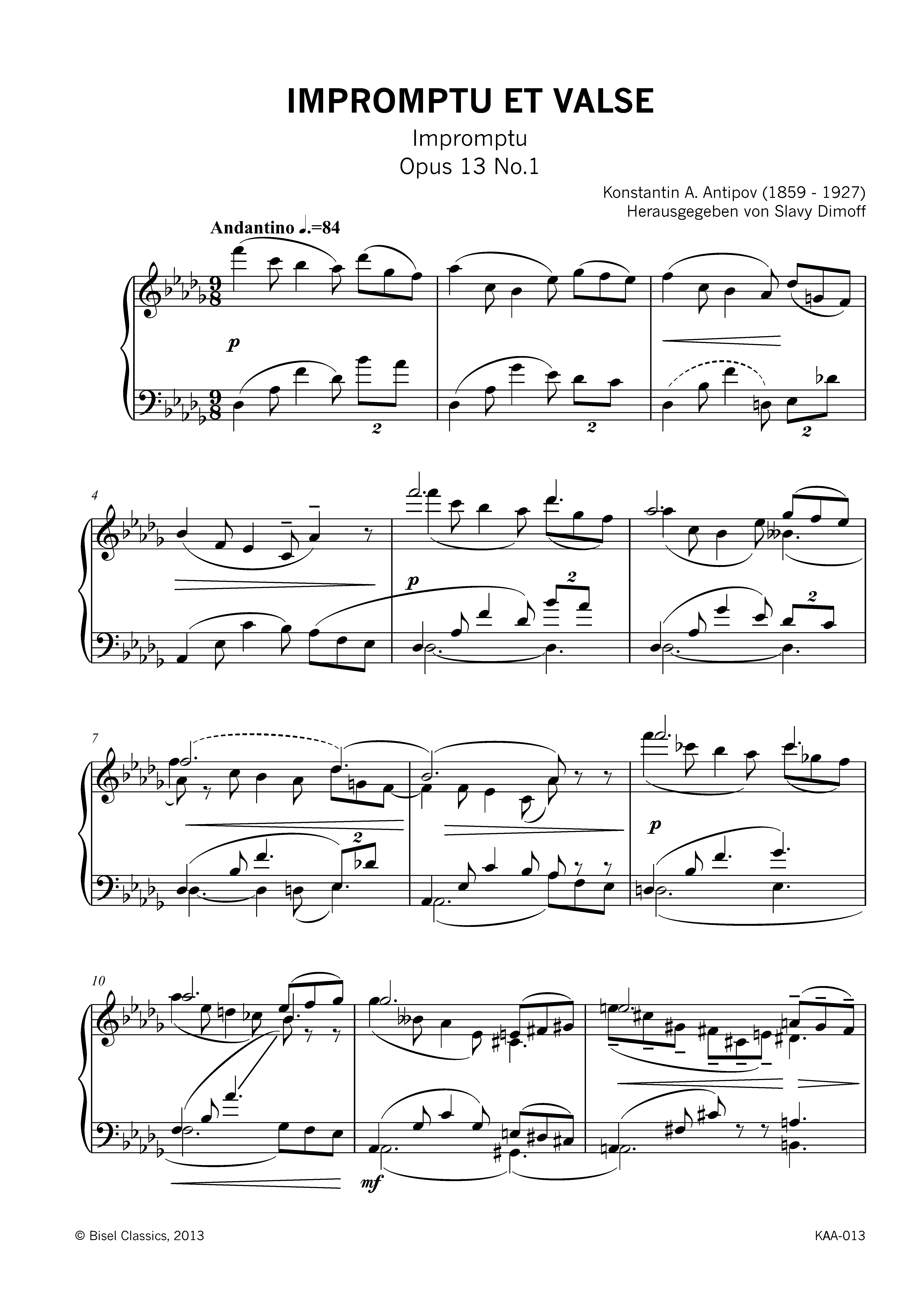 If his career had not turned so decisively towards employment in the navy, Antipov would have continued composing after this last opus No. 13. He may have hoped to combine both activities like his maestro Rimsky-Korsakov did, and it just didnt work out as well for him, but sadly, this and all further circumstances of his life and death remain unknown to us. Thus do these last miniatures, Impromptu et Valse appear all the more precious to the performer and audience today, as they offer a glimpse of rare gems of Russian romanticism.