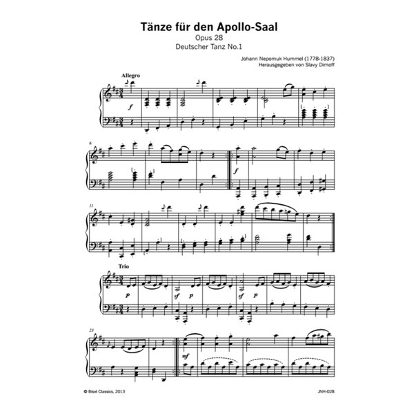 With his Op. 28 Hummel composed another series of dances dedicated to the Apollosaal, the most fascinating amusement hall of Old Vienna, which had been opened up on the 10 of January of the same year. It includes twelve Deutsche Tänze with additional Trios and a large Coda. The second version of the part of Deutscher Tanz No.9 which quotes Hummels ballet Helena und Paris immensely popular at the time, adds character to the collection. These enjoyable musical miniatures offer an interesting glimpse into the creation history of the classical waltz and the world famous Viennese dance culture. They retain their charm as dance music to the present day.