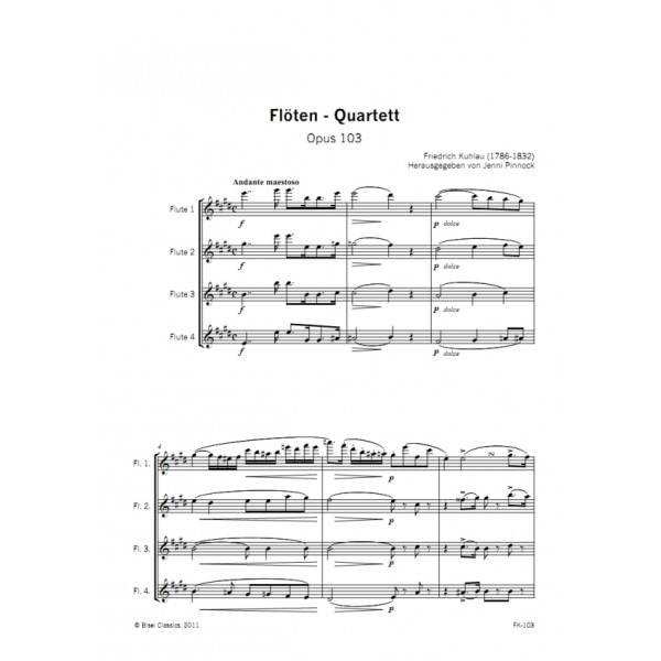 Friedrich Kuhlaus works bridge the Classical and Romantic musical periods, and his extensive and brilliant flute writing earned him the title of the Beethoven of the flute. The Flöten-Quartett for four flutes explores the range and expressive nature of the quartet. Kuhlaus works are well known for suiting both the amateur and professional performer; this quartet is no different, featuring parts ranging in difficulty in order to produce a wonderful, diverse work, which will be a delight for any ensemble to perform.