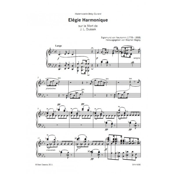 The Elegie harmonique and Marche Funebre were composed in memoriam of Jan Ladislav Dussek a Czech piano virtuoso who had befriended Neukomm through their mutual acquaintance of the Prince Talleyrand. The early Romantic style of Neukomm seen here, is in keeping both with the prevailing conventions of the day and the idiomatic writing of Dussek who enjoyed a virtuoso career that would pave the way musically and dramatically for figures such as Liszt, Mendelssohn, Chopin...