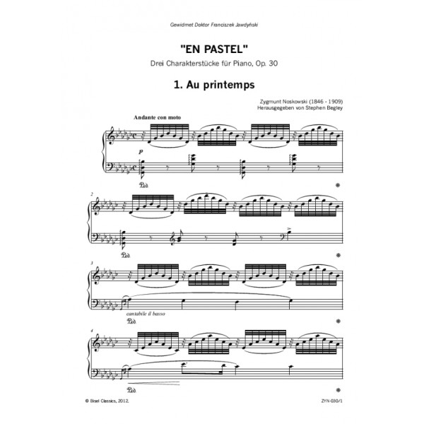 En Pastel, Trois Morceaux caractéristiques pour Piano par Sigismond Noskowski were published in 1890 and dedicated to the Polish surgeon, Doctor Franciszek Jawdyński. Ever since antiquity, philosophers musicians and poets have drawn an analogy between the media of light and sound and in these three pieces, from the elegiac rhapsody that opens the work through the brilliant waltz to the exquisite lullaby which concludes the set, Noskowski captured the kaleidoscopic character of the pieces with a masterful, almost painterly precision.