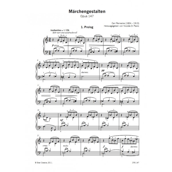 The ability of music to tell stories is exemplified in Reineckes Märchengestalten, where the worlds of fantasy and fairytale are evoked from the title itself. Combining the talents of pianist, composer, and teacher, with those of painter and poet, his works cover a wide variety of genres. In his lifetime, he witnessed the formation of the German Romantic School, from the beginning to its end. The programmatic form of opus 147 make these delightful pieces eminently suitable background music for the tales they are narrating.