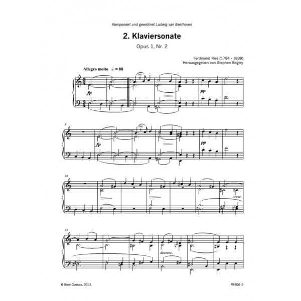 The second of two sonatas was dedicated to Beethoven his great friend and mentor and was composed at a time when Ries was studying piano with Beethoven and composition with Albrechtsberger in Vienna in 1803. The work is divided into three movements with an unusual reversal of form that sees the first movement placed last and is technically the most demanding of the pair with a generous offering of bravura passagework. A virtuoso composition full of heat and fire that will test and showcase the skill of any performer who accepts the challenge this work presents.