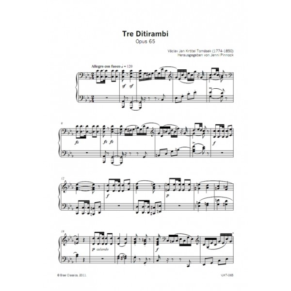 Tomásek was a Czech pianist, teacher and composer, who wrote a large number of piano works during his lifetime. Tre Ditirambi is a collection of three highly virtuosic, dramatic pieces, exploring a wide range of styles and fully exploiting the range of the piano.