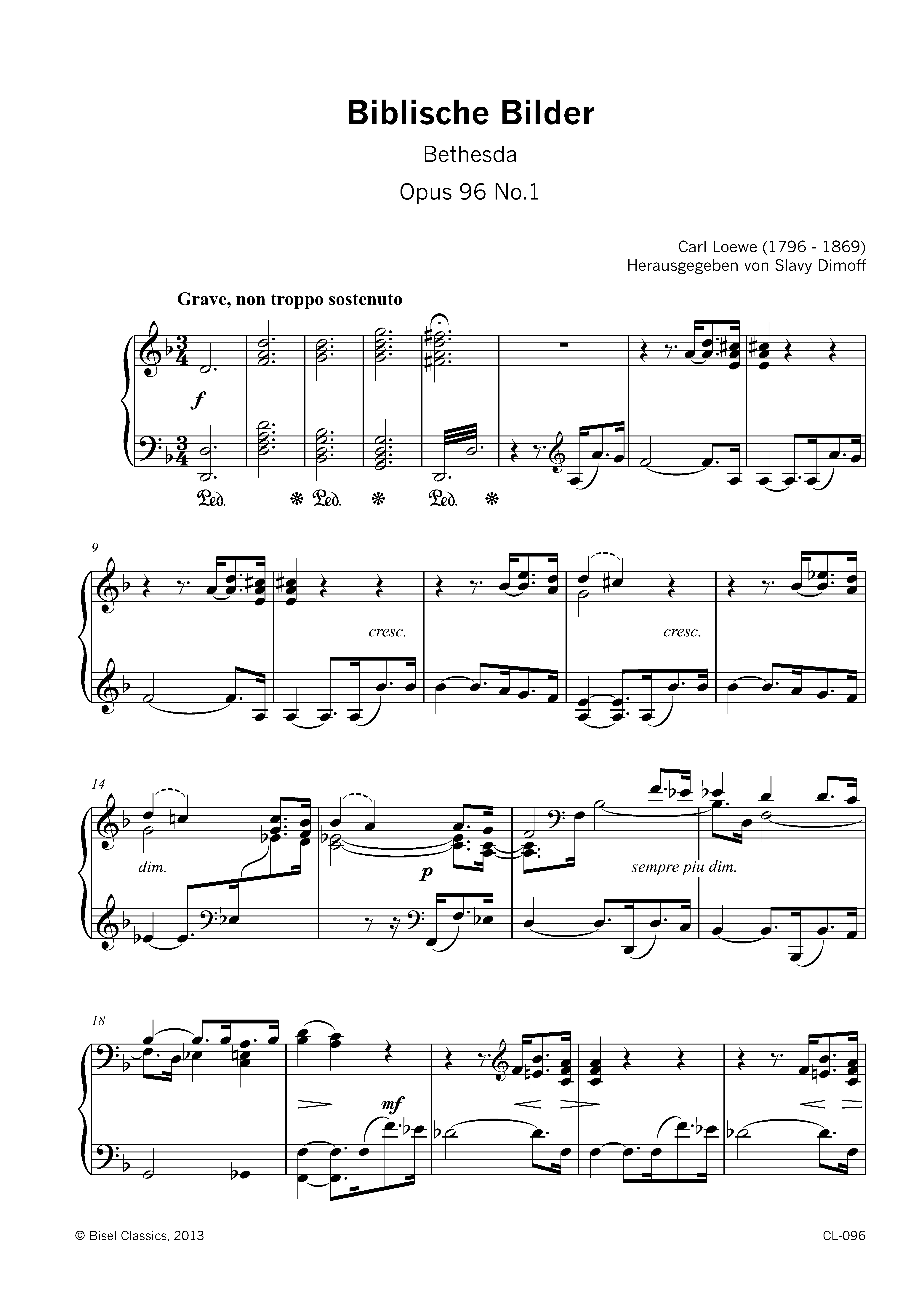 With his three part composition Biblical images Op. 96 Loewe created a work of surprising narrative intensity, as may be expected from a master of the German ballad. Like no other, he knew how to put the deeper meaning of the words about those three events in the New Testament to music, which references the presence of the divine in its partly simple, partly abundant expressivity. As a valuable missing link between the treasure-trove that is represented by Loewes ballads and his eminent oratories these programmatic works for piano solo are bound to enrich any romantic repertoire with their strong imagery.