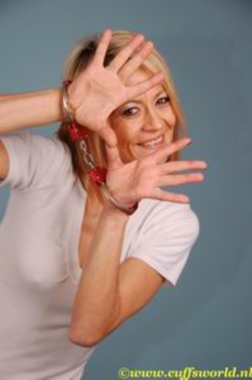 Here she is again, our sexy model Alyssa. She is possing this time barefoot, but no cuffs around her ankles. She has seen our red collored handcuffs of the brand Kyoung-Chang, she likes them and want to try them, but theses only.