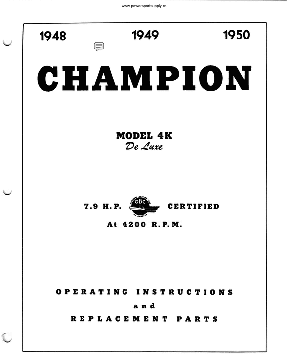 Champion 7.9 HP 4K outboard motor owners operating instructions and parts manual 1946 49 50