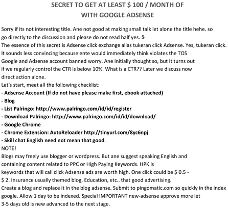 in this ebook you will discover how the easiest way to earn money from adsense only the shortest possible time. I promised at least if you seriously read this ebook is that you will get at least 100 dollars. the secret of this ebook, you do not have to think hard difficult seo problems and the like because in this ebook you can lesson on how you set up your adsense income in accordance with your wishes. grab it and see