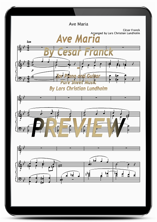 Pure Sheet Music Ebook; Ave Maria By Cesar Franck; Piano and Guitar; César Franck; Romantic; 1863; Ave Maria; Adagio; Aria; Funeral; Lyrical; Easy; French; Belgium; Slow; Score and 1 Part; FWV 62; Lars Christian Lundholm; sheet music; arrangement; pdf; download; music ebook; Romantic sheet music for Piano and Guitar; Easy level sheet music for Piano and Guitar; Slow tempo sheet music for Piano and Guitar; Piano and Guitar sheet music from the Decade of Years 1860 to 1869; Piano and Guitar sheet music from the 19th Century - Years 1801 to 1900; Piano and Guitar sheet music composed by César Franck